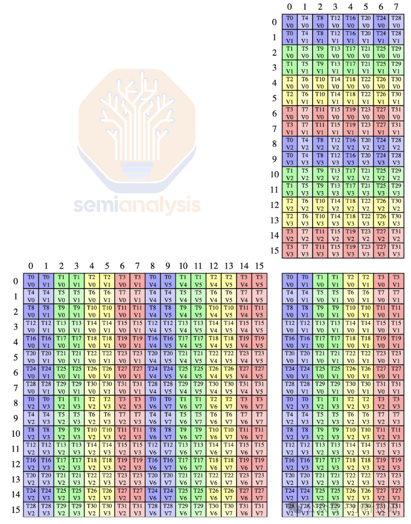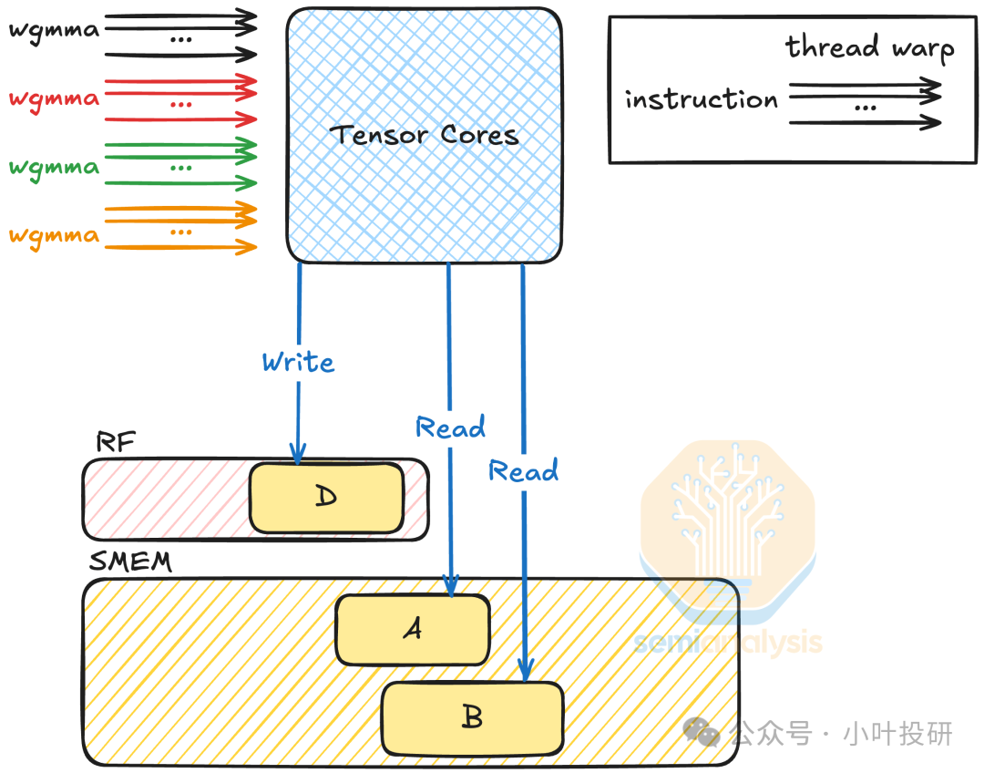 引入256KB SM级张量内存(TMEM),以warpgroup为单位访问,每个warp仅操作特定存储通道,硬件端口需求减少30%。操作数直接从共享内存/TMEM读取,彻底摒弃寄存器存储矩阵。