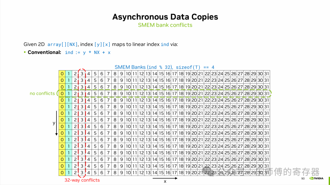 SMEM由32个bank组成,在一次访问中,可以同时读/写多个bank,但一个bank只允许读一个和写一个元素,如果同时读/写的两个元素在同一个bank中,则称为bank conflict,只能等一个访问结束后才允许另一个访问。如下图,一列为一个bank,一共32个bank。
