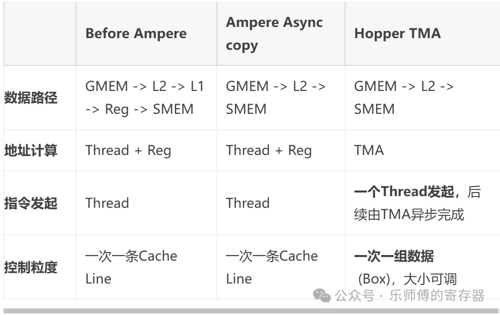为了解决这一问题,英伟达在Hopper架构中引入了 Tensor Memory Accelerator (TMA)2,将数据访问的复杂性从软件层(线程)剥离,交由专用硬件(TMA)处理,实现数据搬运与计算解耦。
