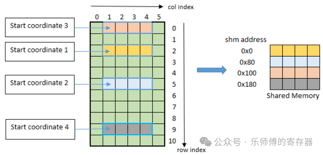 下图举例为gather4 mode,提供起始坐标(1, 2), (1, 5), (1, 0) ,(1, 9),以及搬运长度4,TMA将按坐标顺序,把这四行搬运进SMEM中,并拼到连续四行。