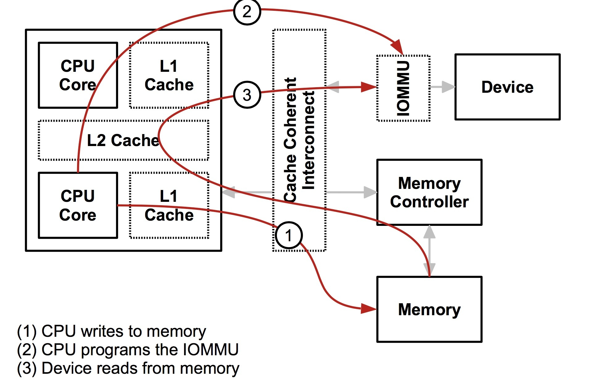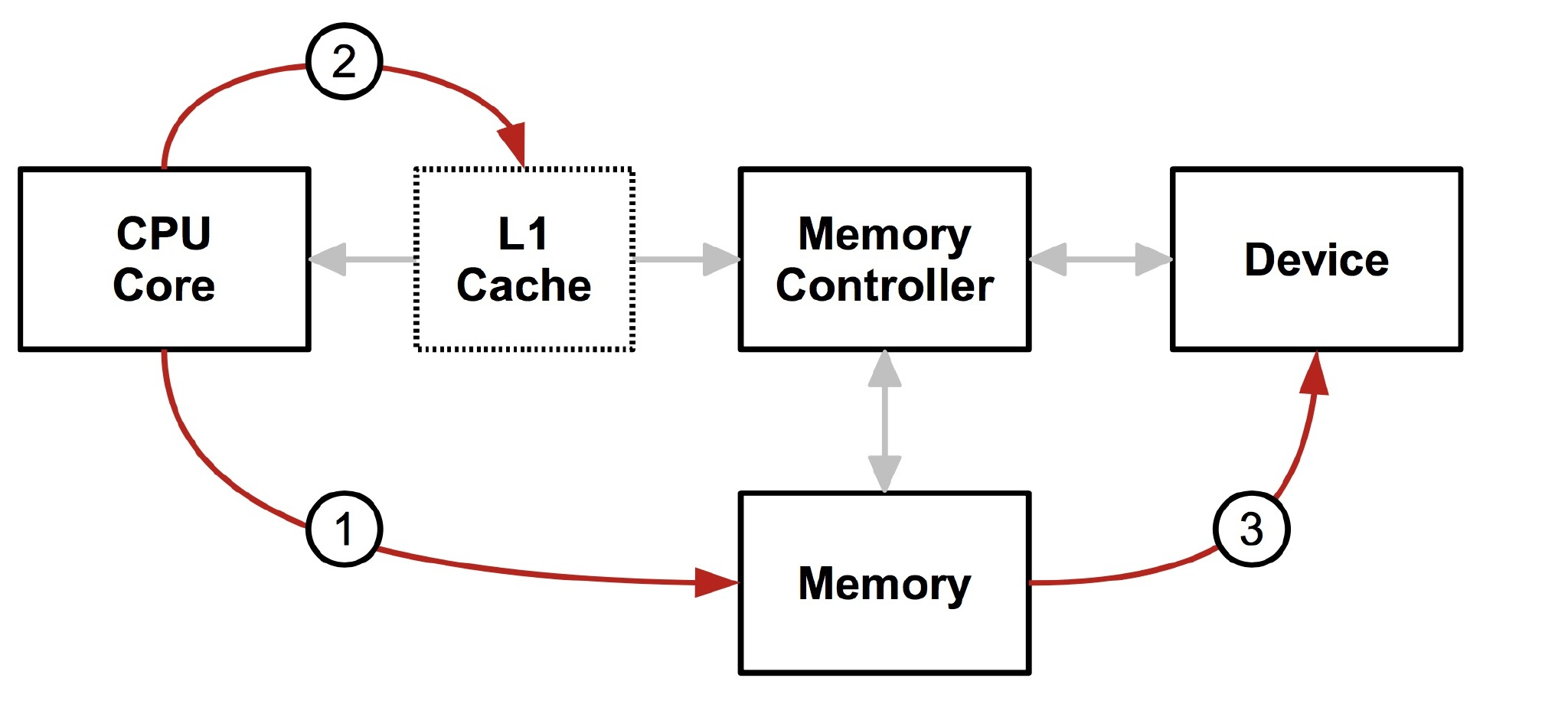 CPU 向内存写数据,但是先要清空到不一致的缓存,然后设备再去读数据,不然设备读到的数据和 CPU 实际的数据会不一致(因为缓存里的数据可能和存储器的不一致),而且实际上缓存也不只是一层,所以需要一个中间层来保证 从 CPU 的角度和从设备的角度内存都是一致的,所以就有了下面这个结构。