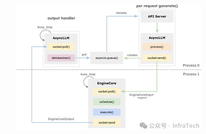 通过生产者/消费者队列的方式把上层(AsyncLLM Engine)与中间层(EngineCore)联系起来,Process0发送请求到Engine Core的等待队列,AsyncLLM层进行poll轮询查询请求结果,请求处理完成后Engine Core放入另一个队列中;Engine Core与worker的传递方式保持不变。队列处理细节上面,EngineCore队列和AsyncLLM Engine的输出处理上面都使用了”busy_loop”方式。
