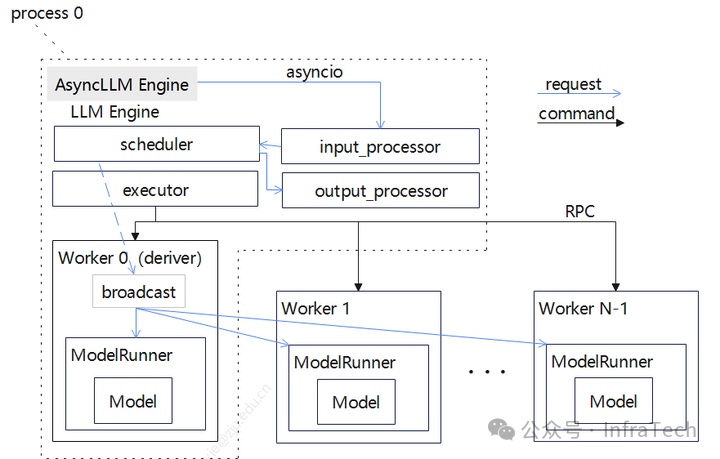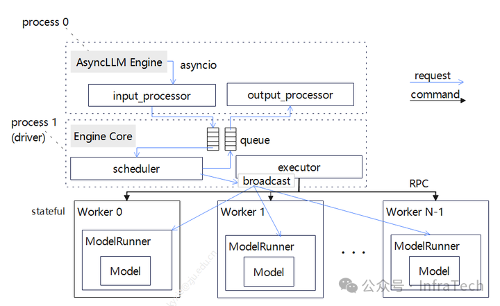 调度器scheduler的变化:把部分功能进行了下沉,且scheduler去状态化,worker则变为有状态化(stateful),需要记录请求相关信息。scheduler与work0不共线程,在TP场景下scheduler下发的请求广播不再由worker0进行,而是由scheduler所在进程执行,这样worker与executor的交互变得清晰。